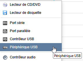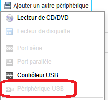 Si dans le listing des périphériques, la ligne « Périphérique USB » est grisée, cela veut dire qu’il n’y a pas de nouveau périph à ajouter (ou qu’il est déjà ajouté dans une autre VM).