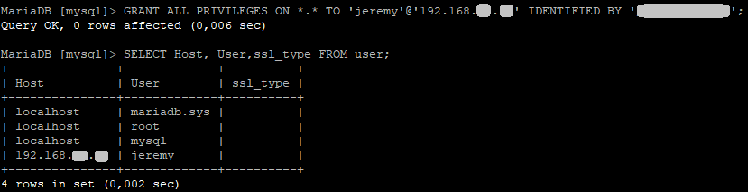 Je créé donc un nouvel utilisateur « jeremy » qui pourra se connecter depuis l’IP de son ordinateur (192.168.0.10), avec tous les pouvoirs :
