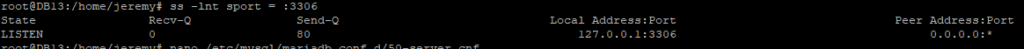 On va donc éditer le fichier /etc/mysql/mariadb.conf.d/50-server.cnf pour qu’il écoute aussi les IP externes.