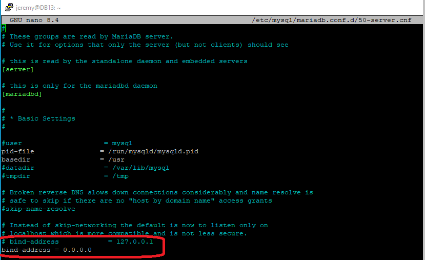 On ajouter un # devant « bind-address = 127.0.0.1 » pour mettre en commentaire la ligne