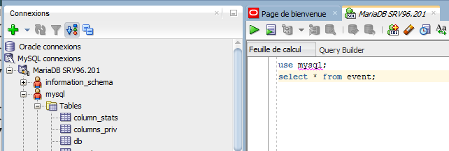 Voilà, SQL-Developer est connecté à la base MariaDB :