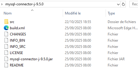 2/ On dézippe le fichier que l’on vient de télécharger (« mysql-connector-j-9.5.0 » dans mon cas).